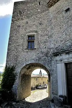 Si la partie haute du château est ruinée dès le XVIIe siècle, le village reste confiné dans l'enceinte fortifiée, l'entrée du village étant défendue par un important bâtiment construit lui aussi au XIIe siècle mais profondément remanié au XVIe siècle, flanqué néanmoins d'une tour gardant l'unique accès au village.