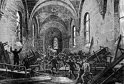 Le , une émeute des sympathisants et membres de la bande noire éclate, deux cents à cinq cents mineurs[18], sur une population de trois mille ouvriers, y participent[19],[20]. Une armurerie est pillée par la bande du Bois-du-Verne et les armes (des revolvers principalement) sont redistribuées aux manifestants. La chapelle du Bois-du-Verne est attaquée, la rosace de l'entrée est détruite par une bombe [21], l'édifice est saccagé, puis incendié[22]. Plus tard dans la nuit les carreaux ainsi que la porte du vestibule de l'école des sœurs sont brisés après que des émeutiers y aient pénétré[23].