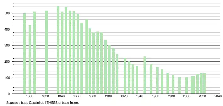 L'évolution du nombre d'habitants est connue à travers les recensements de la population effectués dans la commune depuis 1793. Pour les communes de moins de 10 000 habitants, une enquête de recensement portant sur toute la population est réalisée tous les cinq ans, les populations de référence des années intermédiaires étant quant à elles estimées par interpolation ou extrapolation[26]. Pour la commune, le premier recensement exhaustif entrant dans le cadre du nouveau dispositif a été réalisé en 2008[27].