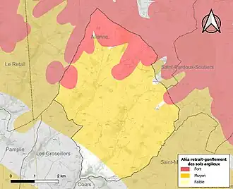 Les mouvements de terrains susceptibles de se produire sur la commune sont des tassements différentiels[16]. Le retrait-gonflement des sols argileux est susceptible d'engendrer des dommages importants aux bâtiments en cas d’alternance de périodes de sécheresse et de pluie[17]. 93,9 % de la superficie communale est en aléa moyen ou fort (54,9 % au niveau départemental et 48,5 % au niveau national)[Carte 2]. Depuis le , en application de la loi ELAN, différentes contraintes s'imposent aux vendeurs, maîtres d'ouvrages ou constructeurs de biens situés dans une zone classée en aléa moyen ou fort[Note 1],[18].
