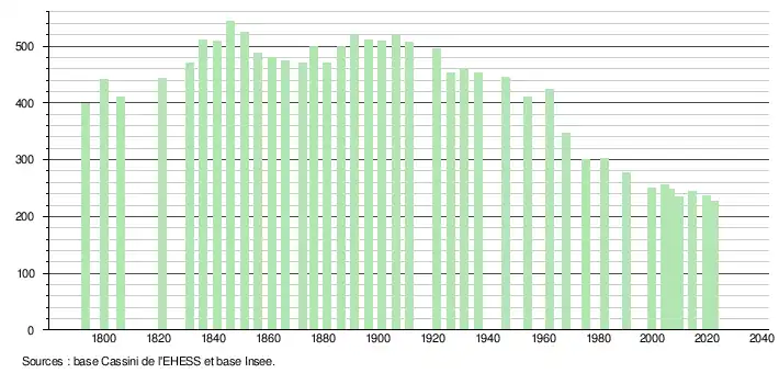 - ↑ Fiches Insee - Populations de référence de la commune pour les années 2006, 2007, 2008, 2009, 2010, 2011, 2012, 2013, 2014, 2015, 2016, 2017, 2018, 2019, 2020, 2021 et 2022.