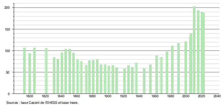 L'évolution du nombre d'habitants est connue à travers les recensements de la population effectués dans la commune depuis 1793. Pour les communes de moins de 10 000 habitants, une enquête de recensement portant sur toute la population est réalisée tous les cinq ans, les populations de référence des années intermédiaires étant quant à elles estimées par interpolation ou extrapolation[23]. Pour la commune, le premier recensement exhaustif entrant dans le cadre du nouveau dispositif a été réalisé en 2005[24].