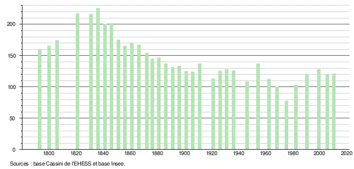 - ↑ Dans le tableau des recensements et le graphique, par convention dans Wikipédia, le principe a été retenu, pour les populations légales postérieures à 1999 de n’afficher dans le tableau des recensements et le graphique que les populations correspondant à l'année 2006, première population légale publiée calculée conformément aux concepts définis dans le décret no 2003-485 du 5 juin 2003, et les années correspondant à une enquête exhaustive de recensement pour les communes de moins de 10 000 habitants, ainsi que la dernière population légale publiée par l’Insee.