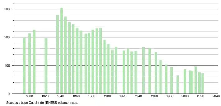 L'évolution du nombre d'habitants est connue à travers les recensements de la population effectués dans la commune depuis 1793. Pour les communes de moins de 10 000 habitants, une enquête de recensement portant sur toute la population est réalisée tous les cinq ans, les populations de référence des années intermédiaires étant quant à elles estimées par interpolation ou extrapolation[28]. Pour la commune, le premier recensement exhaustif entrant dans le cadre du nouveau dispositif a été réalisé en 2008[29].