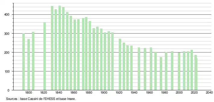 L'évolution du nombre d'habitants est connue à travers les recensements de la population effectués dans la commune depuis 1793. Pour les communes de moins de 10 000 habitants, une enquête de recensement portant sur toute la population est réalisée tous les cinq ans, les populations de référence des années intermédiaires étant quant à elles estimées par interpolation ou extrapolation[28]. Pour la commune, le premier recensement exhaustif entrant dans le cadre du nouveau dispositif a été réalisé en 2006[29].