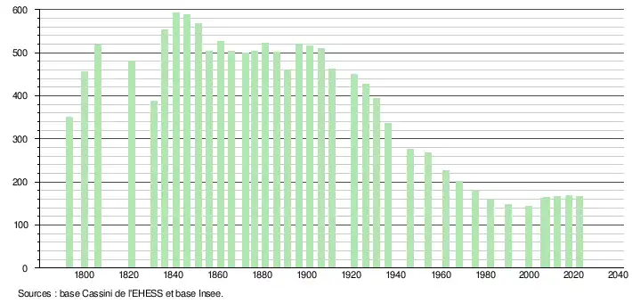 L'évolution du nombre d'habitants est connue à travers les recensements de la population effectués dans la commune depuis 1793. Pour les communes de moins de 10 000 habitants, une enquête de recensement portant sur toute la population est réalisée tous les cinq ans, les populations de référence des années intermédiaires étant quant à elles estimées par interpolation ou extrapolation[23]. Pour la commune, le premier recensement exhaustif entrant dans le cadre du nouveau dispositif a été réalisé en 2007[24].