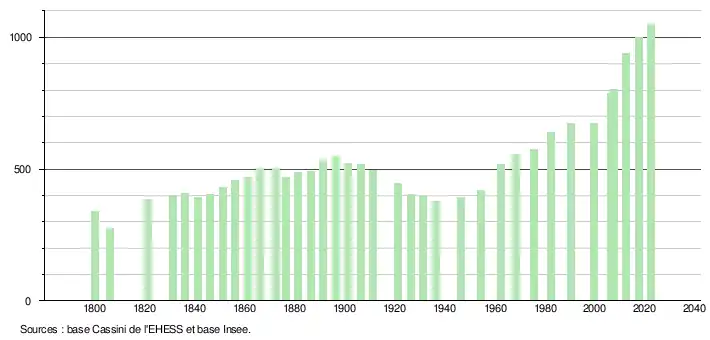 L'évolution du nombre d'habitants est connue à travers les recensements de la population effectués dans la commune depuis 1800. Pour les communes de moins de 10 000 habitants, une enquête de recensement portant sur toute la population est réalisée tous les cinq ans, les populations de référence des années intermédiaires étant quant à elles estimées par interpolation ou extrapolation[16]. Pour la commune, le premier recensement exhaustif entrant dans le cadre du nouveau dispositif a été réalisé en 2007[17].