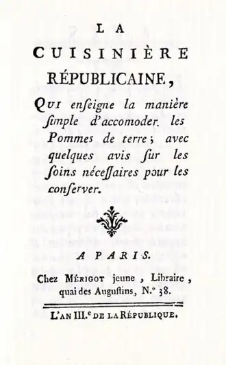 La Cuisinière républicaine, qui enseigne la manière simple d’accomoder les pommes de terre ; avec quelques avis sur les soins nécessaires pour les conserver est un livre de cuisine entièrement consacré à la cuisine de la pomme de terre, paru en l'an III du calendrier républicain, au printemps 1794[1]. Il est publié par Mérigot jeune, au no 38 quai des Grands-Augustins à Paris.