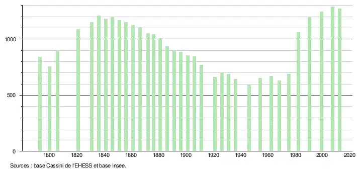 - ↑ Par convention dans Wikipédia, le principe a été retenu de n’afficher dans le tableau des recensements et le graphique, pour les populations légales postérieures à 1999, que les populations correspondant à une enquête exhaustive de recensement pour les communes de moins de 10 000 habitants, et que les populations des années 2006, 2011, 2016, etc. pour les communes de plus de 10 000 habitants, ainsi que la dernière population légale publiée par l’Insee pour l'ensemble des communes.
