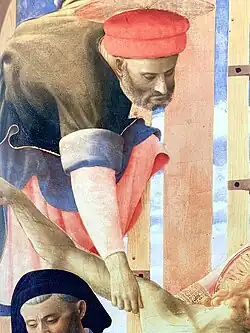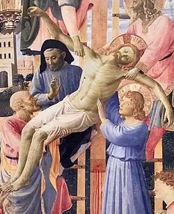 Le personnage debout soutenant le corps du Christ et vêtu de bleu est Saint-Jean ; au-dessus se trouve Nicodème. Mais la figure la plus intéressante plastiquement dans ce groupe est celle de Joseph d'Arimathie, au sommet de l'échelle. Sa position et sa représentation sont très novatrices, il est plié sur lui-même dans une pose beaucoup plus souple et originale que les autres, et cette position permet à Fra Angelico d'appliquer les règles du raccourci anatomique. La figure de Joseph d'Arimathie est alors traitée avec bien plus de volume que les autres personnages, et c'est aussi le seul pour lequel le peintre dessine une auréole en perspective.