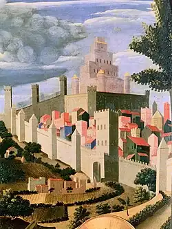 Fra Angelico évoque également la prospérité de Florence en représentant la riche campagne au pied de ses murs, où l'on distingue des vignes et des champs.