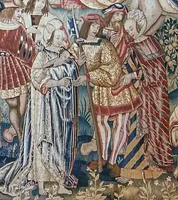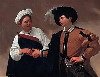 À droite, le jeune homme, la main gauche sur la hanche, donne l'impression d'un fanfaron qui, trop occupé à impressionner la gitane qui l'aguiche, ne réalise pas qu'il se fait voler. Son costume est déjà daté lors de la création de l’œuvre, la mode étant à l'époque pour les pages élégants de s'habiller à l'ancienne. Il porte un chapeau à plume et une épée à la taille[3]. Les vêtements et l'épée, typique en Europe au XVIe siècle, sont représentés avec un sens du détail très aigu[4].