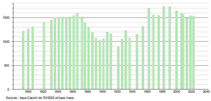 L'évolution du nombre d'habitants est connue à travers les recensements de la population effectués dans la commune depuis 1793. Pour les communes de moins de 10 000 habitants, une enquête de recensement portant sur toute la population est réalisée tous les cinq ans, les populations de référence des années intermédiaires étant quant à elles estimées par interpolation ou extrapolation[28]. Pour la commune, le premier recensement exhaustif entrant dans le cadre du nouveau dispositif a été réalisé en 2008[29].