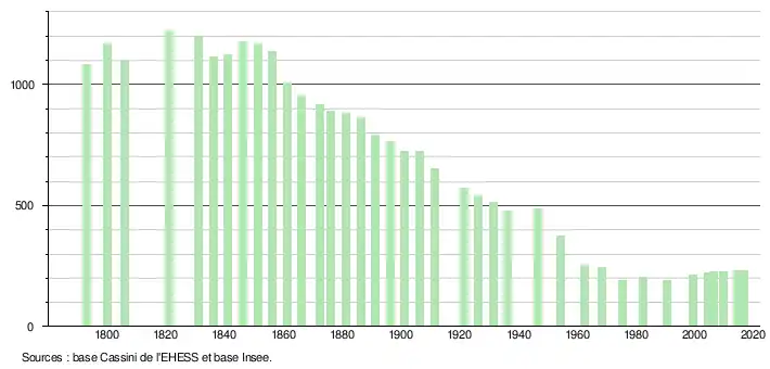 L'évolution du nombre d'habitants est connue à travers les recensements de la population effectués dans la commune depuis 1793. Pour les communes de moins de 10 000 habitants, une enquête de recensement portant sur toute la population est réalisée tous les cinq ans, les populations de référence des années intermédiaires étant quant à elles estimées par interpolation ou extrapolation[10]. Pour la commune, le premier recensement exhaustif entrant dans le cadre du nouveau dispositif a été réalisé en 2004[11].
