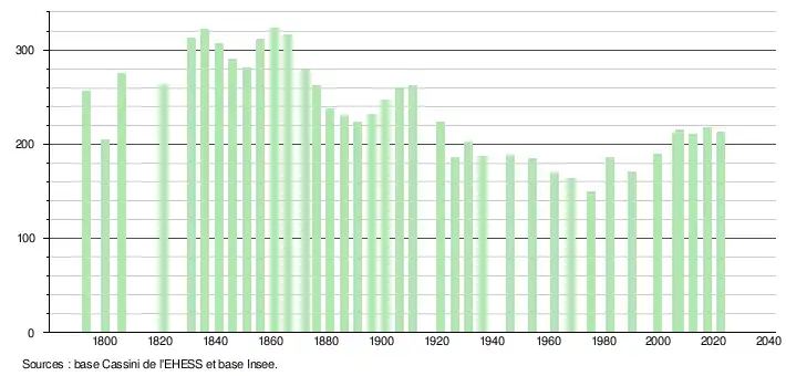 L'évolution du nombre d'habitants est connue à travers les recensements de la population effectués dans la commune depuis 1793. Pour les communes de moins de 10 000 habitants, une enquête de recensement portant sur toute la population est réalisée tous les cinq ans, les populations de référence des années intermédiaires étant quant à elles estimées par interpolation ou extrapolation[17]. Pour la commune, le premier recensement exhaustif entrant dans le cadre du nouveau dispositif a été réalisé en 2007[18].