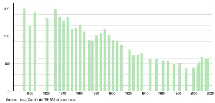 L'évolution du nombre d'habitants est connue à travers les recensements de la population effectués dans la commune depuis 1793. Pour les communes de moins de 10 000 habitants, une enquête de recensement portant sur toute la population est réalisée tous les cinq ans, les populations de référence des années intermédiaires étant quant à elles estimées par interpolation ou extrapolation[13]. Pour la commune, le premier recensement exhaustif entrant dans le cadre du nouveau dispositif a été réalisé en 2004[14].
