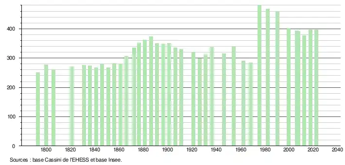 L'évolution du nombre d'habitants est connue à travers les recensements de la population effectués dans la commune depuis 1793. Pour les communes de moins de 10 000 habitants, une enquête de recensement portant sur toute la population est réalisée tous les cinq ans, les populations de référence des années intermédiaires étant quant à elles estimées par interpolation ou extrapolation[23]. Pour la commune, le premier recensement exhaustif entrant dans le cadre du nouveau dispositif a été réalisé en 2007[24].