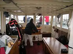 Intérieur de la timonerie de La Horaine, quittant le port de Paimpol, en route pour le passage de la Route du Rhum 2010 au N-E de Bréhat, au large du plateau de la Horaine, dont elle a repris le nom.