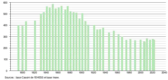 L'évolution du nombre d'habitants est connue à travers les recensements de la population effectués dans la commune depuis 1793. Pour les communes de moins de 10 000 habitants, une enquête de recensement portant sur toute la population est réalisée tous les cinq ans, les populations de référence des années intermédiaires étant quant à elles estimées par interpolation ou extrapolation[15]. Pour la commune, le premier recensement exhaustif entrant dans le cadre du nouveau dispositif a été réalisé en 2005[16].