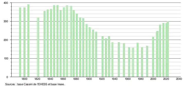 L'évolution du nombre d'habitants est connue à travers les recensements de la population effectués dans la commune depuis 1793. Pour les communes de moins de 10 000 habitants, une enquête de recensement portant sur toute la population est réalisée tous les cinq ans, les populations de référence des années intermédiaires étant quant à elles estimées par interpolation ou extrapolation[14]. Pour la commune, le premier recensement exhaustif entrant dans le cadre du nouveau dispositif a été réalisé en 2005[15].