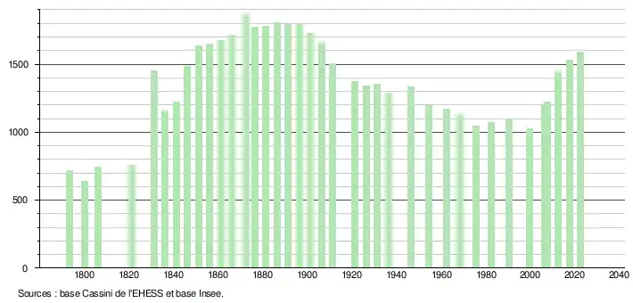 L'évolution du nombre d'habitants est connue à travers les recensements de la population effectués dans la commune depuis 1793. Pour les communes de moins de 10 000 habitants, une enquête de recensement portant sur toute la population est réalisée tous les cinq ans, les populations de référence des années intermédiaires étant quant à elles estimées par interpolation ou extrapolation[17]. Pour la commune, le premier recensement exhaustif entrant dans le cadre du nouveau dispositif a été réalisé en 2007[18].