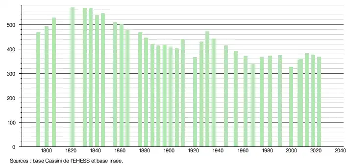 - ↑ Population municipale de référence en vigueur au 1er janvier 2025, millésimée 2022, définie dans les limites territoriales en vigueur au 1er janvier 2024, date de référence statistique : 1er janvier 2022.