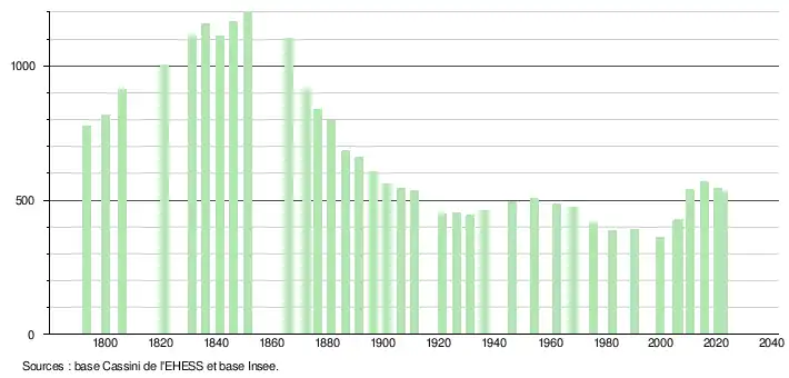 L'évolution du nombre d'habitants est connue à travers les recensements de la population effectués dans la commune depuis 1793. Pour les communes de moins de 10 000 habitants, une enquête de recensement portant sur toute la population est réalisée tous les cinq ans, les populations de référence des années intermédiaires étant quant à elles estimées par interpolation ou extrapolation[17]. Pour la commune, le premier recensement exhaustif entrant dans le cadre du nouveau dispositif a été réalisé en 2005[18].
