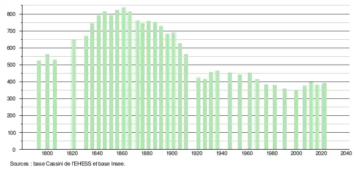 L'évolution du nombre d'habitants est connue à travers les recensements de la population effectués dans la commune depuis 1793. Pour les communes de moins de 10 000 habitants, une enquête de recensement portant sur toute la population est réalisée tous les cinq ans, les populations de référence des années intermédiaires étant quant à elles estimées par interpolation ou extrapolation[25]. Pour la commune, le premier recensement exhaustif entrant dans le cadre du nouveau dispositif a été réalisé en 2006[26].