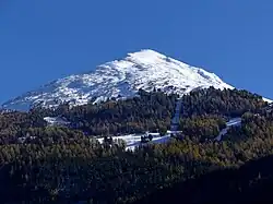 Vue de la Norma depuis la Maurienne à l'ouest avec ses pentes couvertes par les remontées mécaniques et pistes de ski de la station de la Norma. | |||