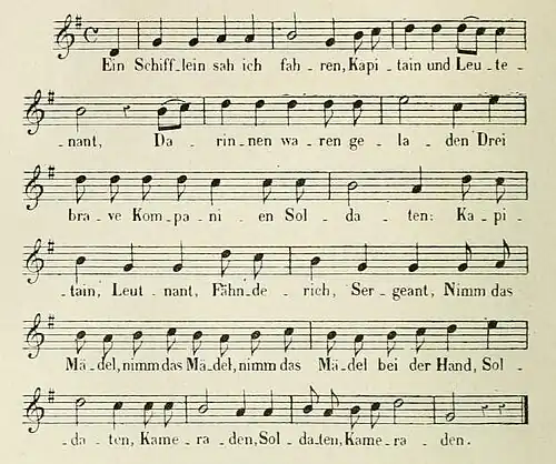 - ↑ Partition et paroles de la chanson allemande données par J. B. Weckerlin La Chanson populaire, Firmin-Didot éditeur, Paris 1886, page 54. Traduction du texte allemand :