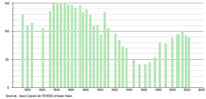 L'évolution du nombre d'habitants est connue à travers les recensements de la population effectués dans la commune depuis 1793. Pour les communes de moins de 10 000 habitants, une enquête de recensement portant sur toute la population est réalisée tous les cinq ans, les populations de référence des années intermédiaires étant quant à elles estimées par interpolation ou extrapolation[19]. Pour la commune, le premier recensement exhaustif entrant dans le cadre du nouveau dispositif a été réalisé en 2008[20].