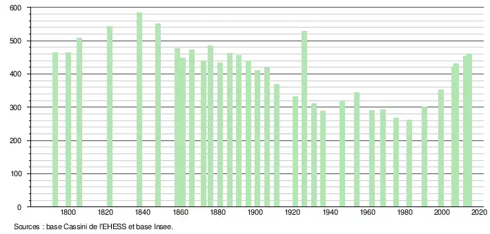 L'évolution du nombre d'habitants est connue à travers les recensements de la population effectués dans la commune depuis 1793. Pour les communes de moins de 10 000 habitants, une enquête de recensement portant sur toute la population est réalisée tous les cinq ans, les populations de référence des années intermédiaires étant quant à elles estimées par interpolation ou extrapolation[8]. Pour la commune, le premier recensement exhaustif entrant dans le cadre du nouveau dispositif a été réalisé en 2007[9].