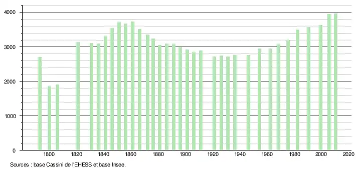 L'évolution du nombre d'habitants est connue à travers les recensements de la population effectués dans la commune depuis 1793. À partir du , les populations légales des communes sont publiées annuellement dans le cadre d'un recensement qui repose désormais sur une collecte d'information annuelle, concernant successivement tous les territoires communaux au cours d'une période de cinq ans. Pour les communes de moins de 10 000 habitants, une enquête de recensement portant sur toute la population est réalisée tous les cinq ans, les populations légales des années intermédiaires étant quant à elles estimées par interpolation ou extrapolation[19]. Pour la commune, le premier recensement exhaustif entrant dans le cadre du nouveau dispositif a été réalisé en 2005[20],[Note 1].