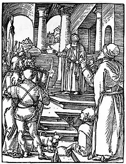 Pour composer l'espace et la profondeur de la scène, Raphaël s'inspire savamment du Christ devant Pilate de la Petite Passion, gravure sur bois d'Albrecht Dürer (vers 1508-1509). Raphaël porte une véritable admiration à l'œuvre de Dürer, comme rapporté notamment par Giorgio Vasari dans Les Vies des meilleurs peintres, sculpteurs et architectes et la maîtrise pleinement. L'estrade sur laquelle se tient l'apôtre, vu de dos dans l'estampe de Raphaël, est une reprise, sous l'angle opposé, de celle sur laquelle se tient Ponce Pilate, de face dans l'œuvre de Dürer[1].