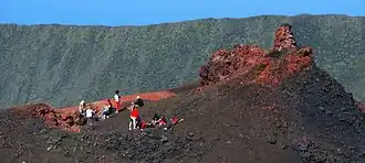 La Réunion est une île volcanique née il y a quelque trois millions d'années[20] avec l'émergence du volcan bouclier du piton des Neiges qui est aujourd'hui, avec une altitude de 3 070,50 mètres, le sommet le plus élevé des Mascareignes et de l'océan Indien[21]. L'est de l'île est constitué par le piton de la Fournaise, un autre volcan bouclier bien plus récent (500 000 ans) qui est considéré comme l'un des plus actifs de la planète. La partie émergée de l'île ne représente qu'un faible pourcentage (environ 3 %) de la montagne sous-marine qui la forme.