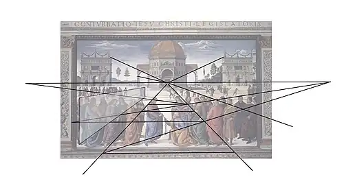 La scène principale est encadrée par les lignes en perspective d'un pavement à grosses dalles carrées en marbre d'une place décorée d'édifices monumentaux. Au centre selon les règles de la symétrie, une rangée centrale de dalles conduit à l'entrée d'un édifice remarquable à plan central avec coupole, symbole de l'universalité du pouvoir papal et transposition idéale du Temple de Jérusalem : Ce motif a été réutilisé dans Le Mariage de la Vierge (musée des beaux-arts de Caen) avec la variante de la porte centrale qui laisse voir le paysage comme infini dans le point de fuite central. Cette vision architecturale, expression des idéaux de perfection classique de la Renaissance a été reprise par les élèves du Pérugin, comme Pinturicchio dans la chapelle Bufalini et surtout Raphaël dans Le Mariage de la Vierge (Pinacothèque de Brera). Elle influença aussi Bramante qui la reproduisit dans le Tempietto.