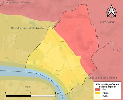 Le retrait-gonflement des sols argileux est susceptible d'engendrer des dommages importants aux bâtiments en cas d’alternance de périodes de sécheresse et de pluie. 96,5 % de la superficie communale est en aléa moyen ou fort (67,4 % au niveau départemental et 48,5 % au niveau national). Sur les 175 bâtiments dénombrés sur la commune en 2019, 175 sont en aléa moyen ou fort, soit 100 %, à comparer aux 84 % au niveau départemental et 54 % au niveau national. Une cartographie de l'exposition du territoire national au retrait gonflement des sols argileux est disponible sur le site du BRGM[27],[Carte 2].