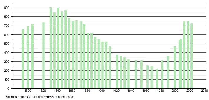 L'évolution du nombre d'habitants est connue à travers les recensements de la population effectués dans la commune depuis 1793. Pour les communes de moins de 10 000 habitants, une enquête de recensement portant sur toute la population est réalisée tous les cinq ans, les populations de référence des années intermédiaires étant quant à elles estimées par interpolation ou extrapolation[27]. Pour la commune, le premier recensement exhaustif entrant dans le cadre du nouveau dispositif a été réalisé en 2007[28].