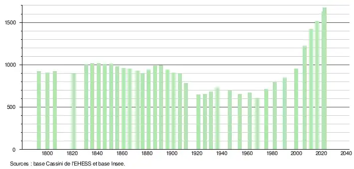 L'évolution du nombre d'habitants est connue à travers les recensements de la population effectués dans la commune depuis 1793. Pour les communes de moins de 10 000 habitants, une enquête de recensement portant sur toute la population est réalisée tous les cinq ans, les populations de référence des années intermédiaires étant quant à elles estimées par interpolation ou extrapolation[17]. Pour la commune, le premier recensement exhaustif entrant dans le cadre du nouveau dispositif a été réalisé en 2006[18].
