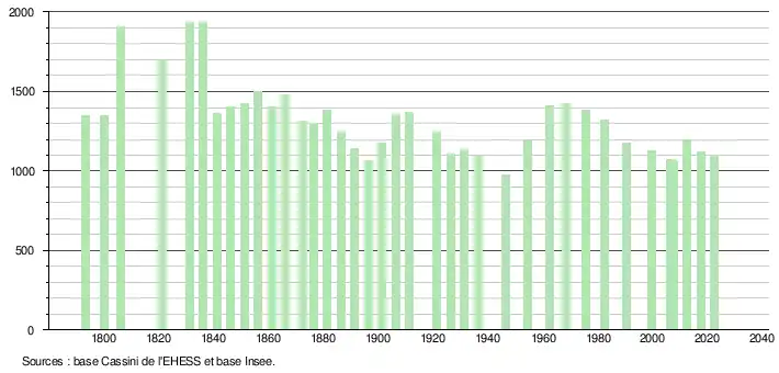 L'évolution du nombre d'habitants est connue à travers les recensements de la population effectués dans la commune depuis 1793. Pour les communes de moins de 10 000 habitants, une enquête de recensement portant sur toute la population est réalisée tous les cinq ans, les populations de référence des années intermédiaires étant quant à elles estimées par interpolation ou extrapolation[42]. Pour la commune, le premier recensement exhaustif entrant dans le cadre du nouveau dispositif a été réalisé en 2007[43].