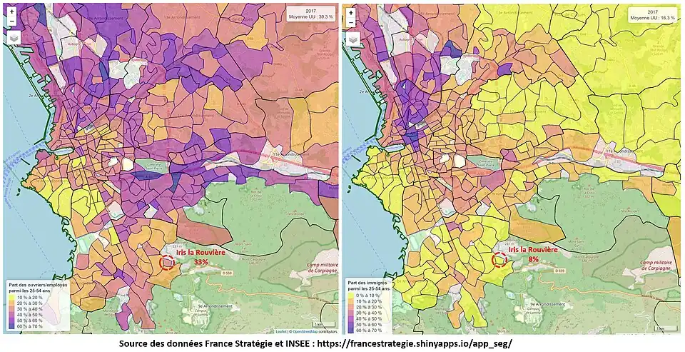 Les cartographies de la sociologie des quartiers de Marseille ci-dessous issus des travaux de France Stratégie et de l'INSEE mettent en évidence plusieurs faits sur la population du quartier iris de la Rouvière :