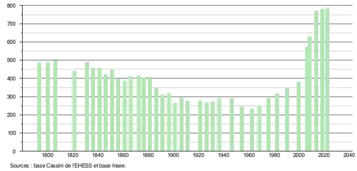 L'évolution du nombre d'habitants est connue à travers les recensements de la population effectués dans la commune depuis 1793. Pour les communes de moins de 10 000 habitants, une enquête de recensement portant sur toute la population est réalisée tous les cinq ans, les populations de référence des années intermédiaires étant quant à elles estimées par interpolation ou extrapolation[22]. Pour la commune, le premier recensement exhaustif entrant dans le cadre du nouveau dispositif a été réalisé en 2008[23].