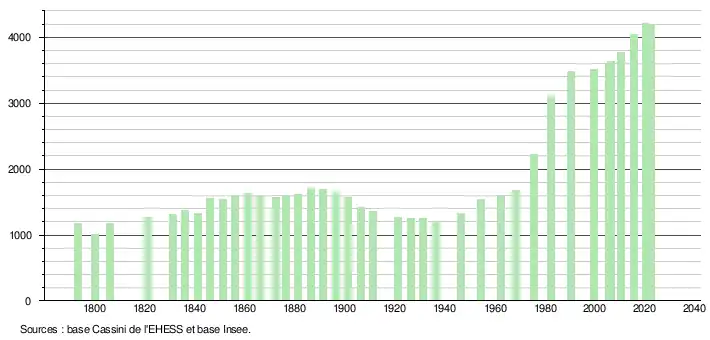 L'évolution du nombre d'habitants est connue à travers les recensements de la population effectués dans la commune depuis 1793. Pour les communes de moins de 10 000 habitants, une enquête de recensement portant sur toute la population est réalisée tous les cinq ans, les populations de référence des années intermédiaires étant quant à elles estimées par interpolation ou extrapolation[30]. Pour la commune, le premier recensement exhaustif entrant dans le cadre du nouveau dispositif a été réalisé en 2005[31].