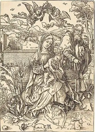 Le thème est presque identique à celui de la La Sainte Famille au papillon, mais avec quelques avancées. Malgré la prédilection reconnaissable pour le mouvement exagéré des plis, les figures ont une monumentalité décisive. Le riche arrière-plan du paysage et les plantes dessinées à côté ou au-dessus du siège herbeux sont nouveaux dans l'art de la gravure sur bois.