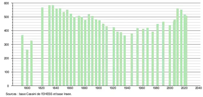L'évolution du nombre d'habitants est connue à travers les recensements de la population effectués dans la commune depuis 1793. Pour les communes de moins de 10 000 habitants, une enquête de recensement portant sur toute la population est réalisée tous les cinq ans, les populations de référence des années intermédiaires étant quant à elles estimées par interpolation ou extrapolation[14]. Pour la commune, le premier recensement exhaustif entrant dans le cadre du nouveau dispositif a été réalisé en 2005[15].