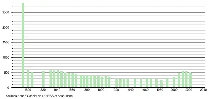 L'évolution du nombre d'habitants est connue à travers les recensements de la population effectués dans la commune depuis 1793. Pour les communes de moins de 10 000 habitants, une enquête de recensement portant sur toute la population est réalisée tous les cinq ans, les populations de référence des années intermédiaires étant quant à elles estimées par interpolation ou extrapolation[24]. Pour la commune, le premier recensement exhaustif entrant dans le cadre du nouveau dispositif a été réalisé en 2006[25].