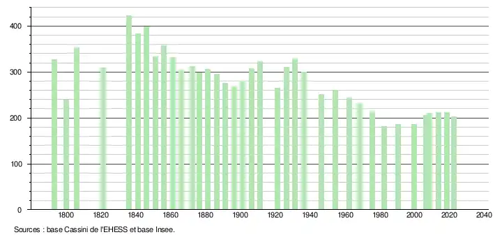 L'évolution du nombre d'habitants est connue à travers les recensements de la population effectués dans la commune depuis 1793. Pour les communes de moins de 10 000 habitants, une enquête de recensement portant sur toute la population est réalisée tous les cinq ans, les populations de référence des années intermédiaires étant quant à elles estimées par interpolation ou extrapolation[30]. Pour la commune, le premier recensement exhaustif entrant dans le cadre du nouveau dispositif a été réalisé en 2008[31].