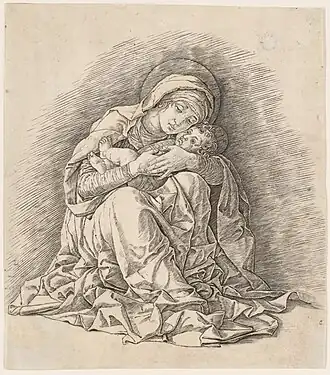 - ↑ Gisèle Lambert, « Mantoue : Andrea Mantegna et son école » [398 a et b. La Vierge à l'Enfant], in Les Premières Gravures italiennes, Paris, Éditions de la Bibliothèque nationale de France, 2000, pp. 188-217 — lire en ligne.