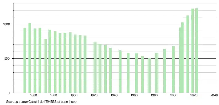 L'évolution du nombre d'habitants est connue à travers les recensements de la population effectués dans la commune depuis 1851. Pour les communes de moins de 10 000 habitants, une enquête de recensement portant sur toute la population est réalisée tous les cinq ans, les populations de référence des années intermédiaires étant quant à elles estimées par interpolation ou extrapolation[19]. Pour la commune, le premier recensement exhaustif entrant dans le cadre du nouveau dispositif a été réalisé en 2008[20].