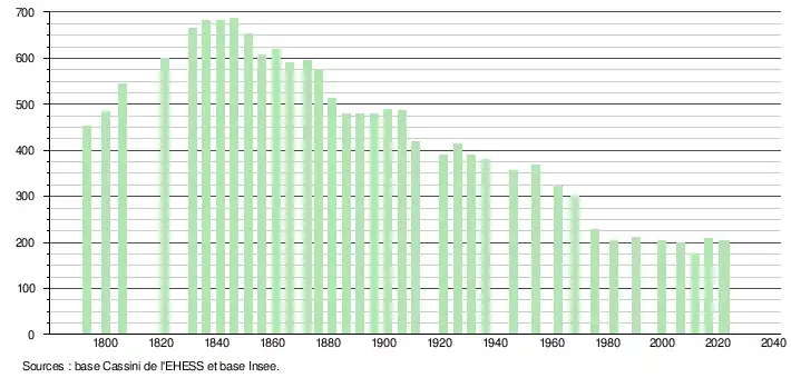 L'évolution du nombre d'habitants est connue à travers les recensements de la population effectués dans la commune depuis 1793. Pour les communes de moins de 10 000 habitants, une enquête de recensement portant sur toute la population est réalisée tous les cinq ans, les populations de référence des années intermédiaires étant quant à elles estimées par interpolation ou extrapolation[23]. Pour la commune, le premier recensement exhaustif entrant dans le cadre du nouveau dispositif a été réalisé en 2006[24].